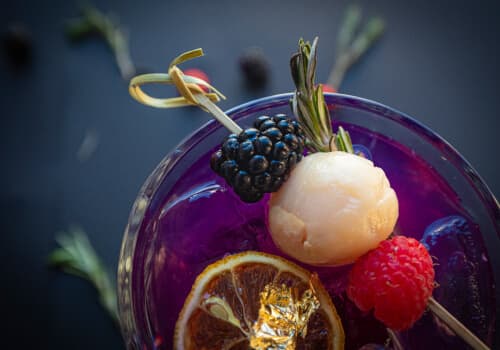 Frambuesa y Zarzamora Macerada en almíbar de lychee, Ginebra (45 ml), Licor de saúco (20 ml), agua mineral y top de refresco de lima.