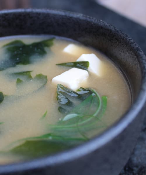 Sopa a base de pasta de frijol de soya fermentada, tofu y wakame